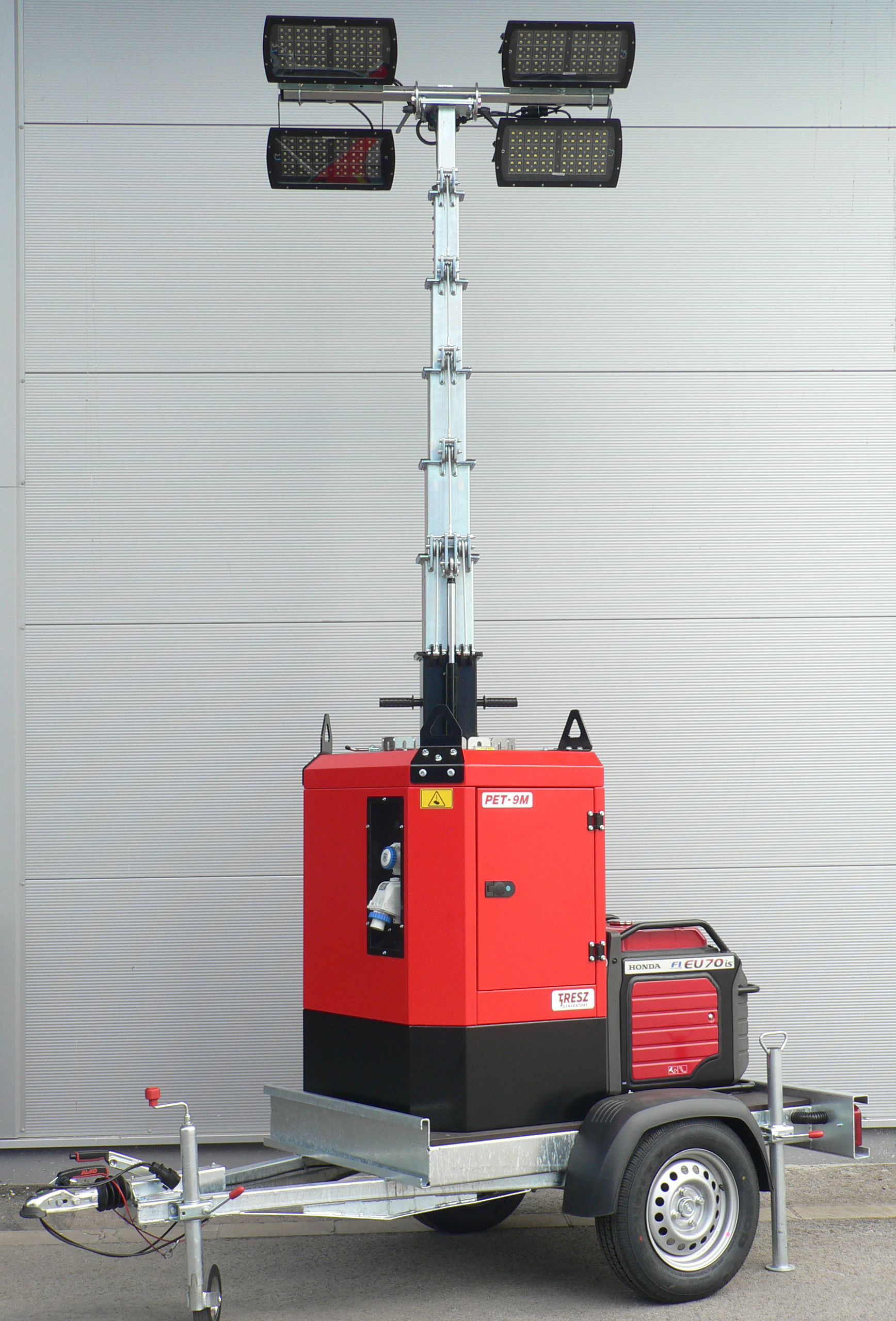 A fénytorony vontatható utánfutóra van szerelve, így könnyen szállítható.